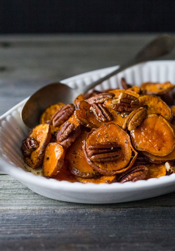 A very simple recipe for roasted yams with maple and pecans that is easy to make and takes 5 minutes of hands on time before going into the oven to bake.